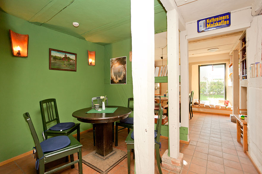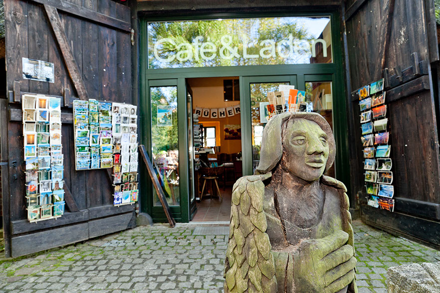 regionaler Lebensmittel, Kunsthandwerk, Bücher, Postkarten und nicht zu vergessen: den Bücherboden mit antiquarischen Büchern, nicht nur bei Regenwetter eine Fundgrube zum Stöbern und Lesen.